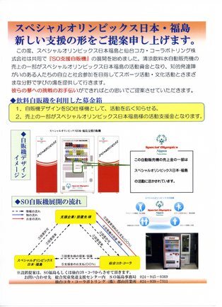 この度、仙台コカ・コーラボトリング株式会社様との共同で『SO支援自販機』の展開を始めました。活動を広く宣伝することは勿論、清涼飲料水自動販売機の売上の一部がスペシャルオリンピックス日本・福島の活動資金となり、知的障がいのある人たちの自立と社会参加を目指してスポーツ活動・文化活動とさまざまな分野で学びの場を提供して行くことが目的です。現在県内で13台が設置されています(平成25年9月時点)。皆様も『彼らの夢への挑戦』のために、是非この新しい形の支援をご検討ください。